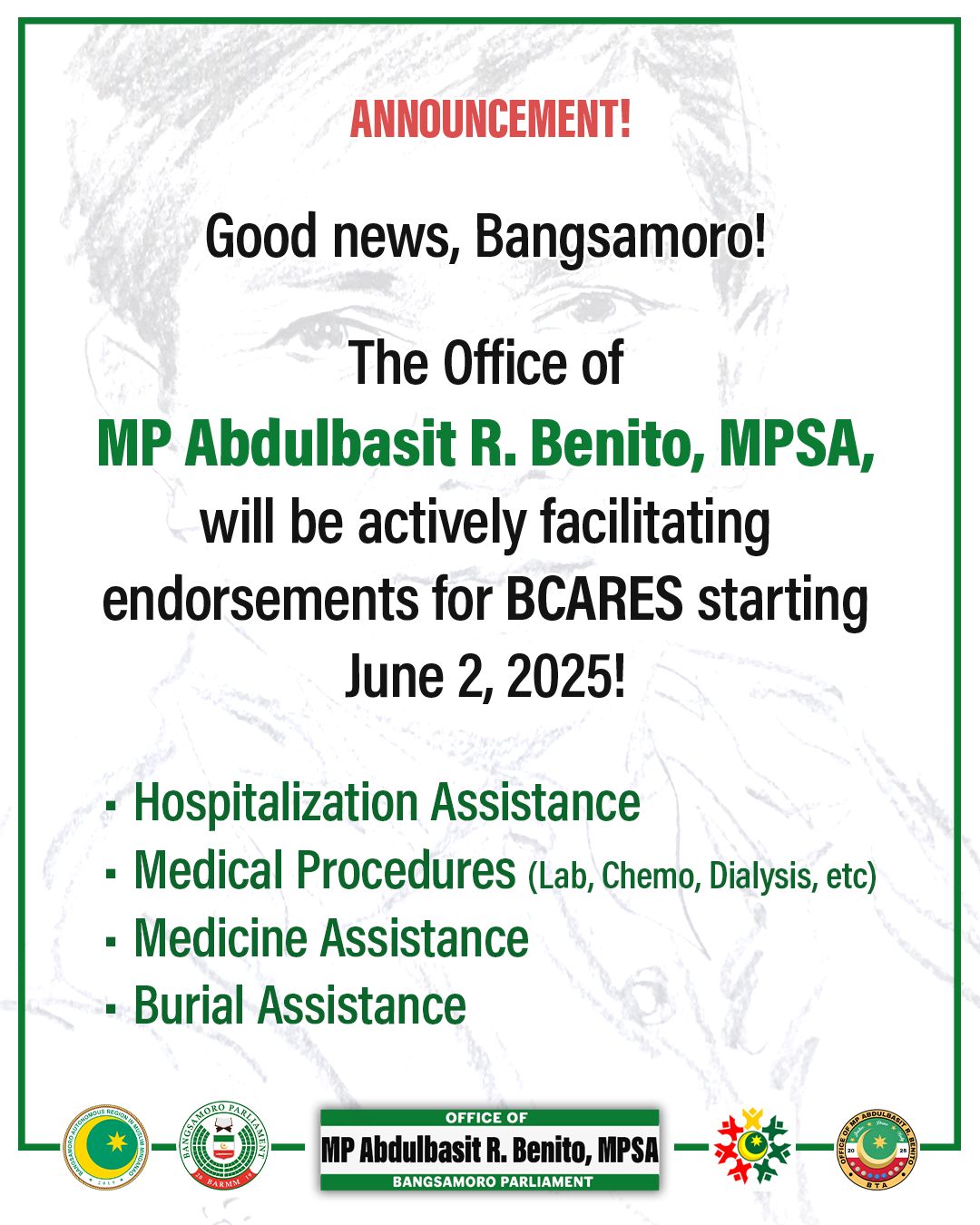 Good news for our Bangsamoro constituents! The Office of MP Abdulbasit R. Benito, MPSA will be assisting those in need to access the assistance for Hospitalization, Laboratories, Medicine, and Burial ...